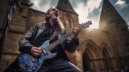 medieval knight singing rock into a microphone dark clouds with blue lightning in the air. --ar 16:9 --c 30