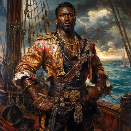 a powerful 1700s-era oil painting capturing the legendary pirate Black Caesar, a towering African figure standing aboard a pirate ship in the Caribbean. He wears a mix of pirate garb and African regalia, his muscular frame adorned with gold jewelry and a sash with vibrant patterns symbolizing his heritage. His expression is fierce yet calculated, holding a curved cutlass in one hand and a pistol in the other, ready for battle. The backdrop features a tropical island on the horizon, with his ship’s crew preparing cannons for an attack. The stormy sky and dark, churning sea reflect the intensity of the moment, while the sunlight breaks through in the distance, symbolizing hope and freedom. The painting’s palette is dominated by deep blues, greens, and fiery oranges, capturing the drama of the high seas and the formidable presence of Black Caesar.