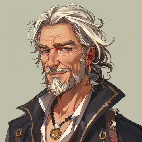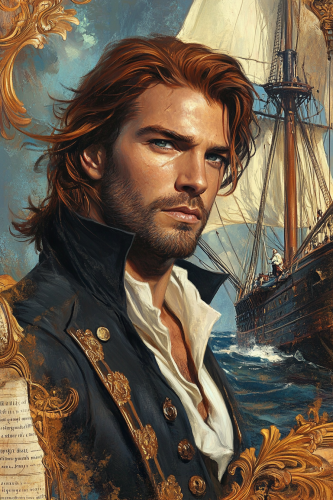 imagine the cover of a romantic novel about a pirate; in the center of the cover, on 1/3 of the image, a man in his thirties, handsome, long red hair, gray eyes, dark skin, short beard, dressed like a 17th-century pirate; the image is edged with magic scrolls; in the background, a three-masted sailing ship of the 18th-century French merchant navy; the atmosphere should reflect the adventure/romance side of the story; --ar 2:3