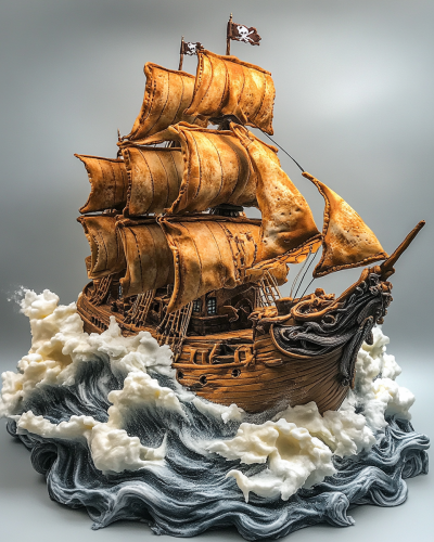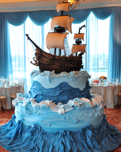 Create a tall and wide novelty cake design of a pirate ship. This pirate ship is on top of a thick round cake which is covered in fondant and butter cream to look like a rough sea with waves splashing away from the large pirate cake design that is on top of the sea cake. This cake is on a dessert table with layers of ocean blue ruffles satin table cloth. The cake has excellent lighting and has curtains in the background that match the tablecloth. The room is decorated like a Pirate theme party. --ar 4:5 --v 6.1 --stylize 30
