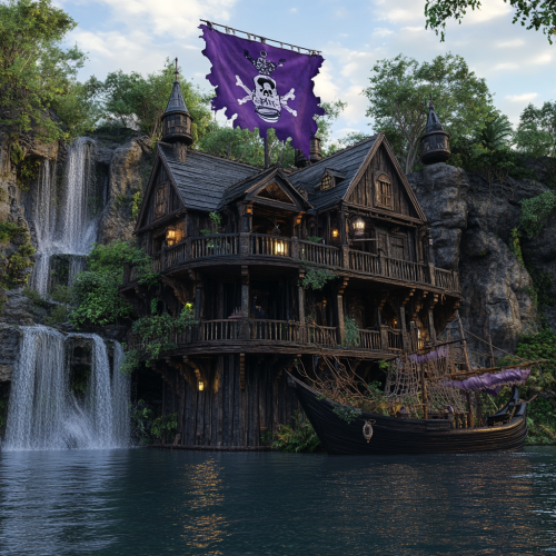 ultra HD hyperrealistic pirate house.The flag hanging in the front is purple and black with a bottle of poison on it, the house is big and it is sitting in the water of a great lake with waterfall on the edge of a jungle, in the water next to the house is her pirate ship. it has the same flag and is made from black wood