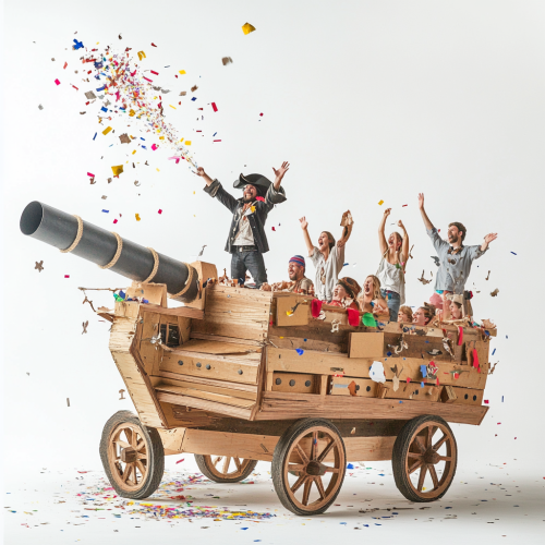 pirate ship made of wood and cardboard in the form of a small platform on wheels at the carnival, on the bow is a pirate shooting from a cannon confetti, around stand a lot of people rejoice and wave to the pirate photographic quality --ar 16:9