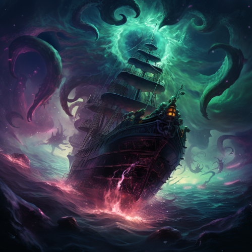 a lovecraftian pirate ship sailing across a cosmic sea. Eldritch creatures with tentacles float alongside the pirate ship. Scary and ominous