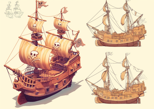 Isometric View of a Whimsical, Simplified Cartoon Art Image of a Small-to-Mid Sized Pirate Ship, 15th Century, Animation Model Sheet, --ar 7:5 --niji 6