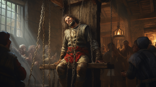 medieval peasant pleading to viking king with flaming axe.
