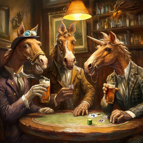 anthropomorphic horse participating in a funny discussion in a local pub, drinking beer, playing cards --v 6.0