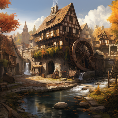 A medieval era town bustling with activity. First-person view. Streets are wide. Overcast skies above. Fantasy RPG setting, wide angle, --ar 16:9 --v 6.1