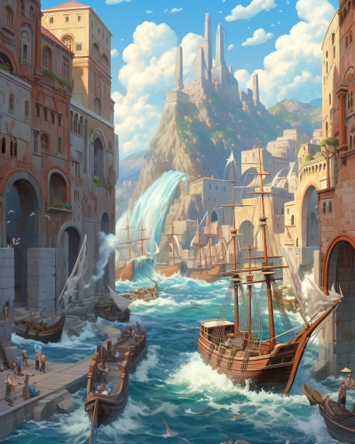 A digital painting of a simple medieval port town, nestled on behind a giant ring wall with waves crashing below, ships sailing in the azure waters. Created Using: detailed stonework, vibrant ocean hues, active harbor life, expansive cityscape, dynamic water effects, period-accurate ships in the art style of hideo minaba --ar 4:5 --niji 5