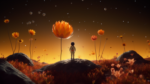 A tiny planet the size of a ball, with three small volcanoes and a single beautiful flower. The Little Prince is standing, looking at his planet as it slowly • spins in space. Pixar style animation, soft colors, dreamy atmosphere --ar 16:9 --v 5.2 --style raw