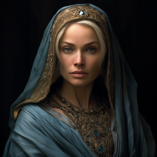medieval portrait, regal, blonde, 50 years old, wrinkles blue eyes, female