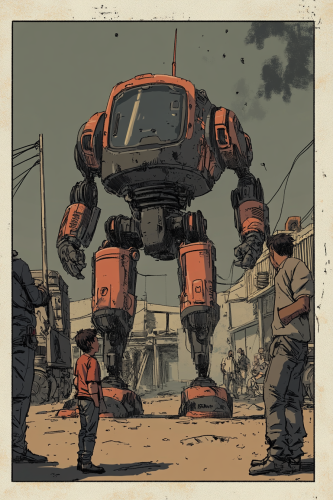 A gray and crimson comic page, be connected cut scene, militaristic realism and normal citizen realism, laurie greasley, narrative. A young child in a small futuristic settlement standing in front of a compact construction robot, confidently insisting it's a cleaning robot. The scene shows a dusty, semi-industrial environment with people working in the background. The robot operator is standing nearby, smiling at the child's innocence. Tightly cropped composition, masterpiece, high detail --ar 2:3