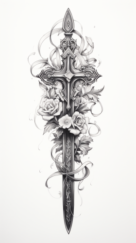a pointillistic ink drawing of a medieval sword, tattoo design, black and white, --ar 9:16