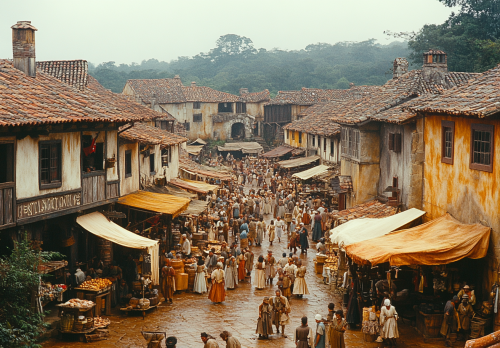 A detailed wide shot photo taken with a 23mm f1.4 lens, Kodachrome slide film wide photo of a very busy medieval market square in the viking settlement in Brazil in the 1540's, where many of the buildings are on wooden stilts. Dozens of townsfolk shopping at stalls that sell all kinds of strange wares, outside, seen in the background are glimpsed the hilly jungle. The mood is grim and the market square is full, at midday on a hot and sweaty, no text, with muted accents in grey, and brown. Grim, gritty and grimy. Fantasy theme. Highly detailed. Highly realistic. --ar 13:9 --v 6.1 --stylize 400