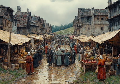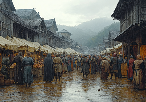A detailed wide shot illustration by Alan Lee of a very busy medieval market square in the rundown and rotting viking settlement in Brazil in the 1540's, where many of the buildings are on wooden stilts, and built in a viking style. Dozens of viking townsfolk shopping at stalls that sell all kinds of strange wares, outside, seen in the background are glimpsed the hilly jungle. The mood is grim and the market square is full, at midday on a cloudy day, muggy and muddy, no text, with muted accents in grey, and brown. Grim, gritty and grimy. Fantasy theme. Highly detailed. Highly realistic. --ar 13:9 --v 6.1 --stylize 500