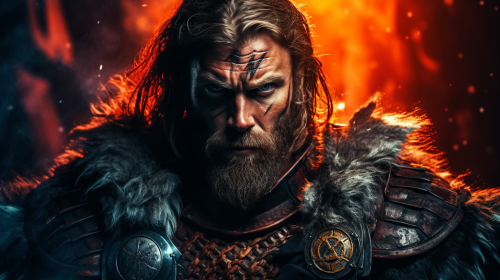 a portrait photograph of a fantasy viking warrior facing the camera, wearing a armour and a helmate. Dramatic firey lighting, hyper realisitc, vivid colour, --ar 16:9