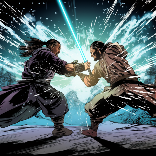 cyberpunk, use comic book layout, in robert valley comic book style Create Extreme close upper body shot of two Jedi fighting wielding glowing lightsabers, lightsaber duel, sparks, action cinematic photograph in the style kung - fu films, Dynamic pose, background: On a mountaing top, snow, petals flying in the air, maelstroms, hyperdetailed, detailed face, symetrical face, beautiful face, photograph taken by John Woo on a RED V - RAPTOR XL 8K VV Cinema Camera, f/5.6, Shutter Speed 1/400, ISO 1900, 100mm lens, wide angle shot, low lighting, cinematic scene, fx, HDR, epic composition, cinematic photo, hyper - realistic, hyper - detailed, cinematic lighting, particle effects, action photography, hyper realistic, 8k resolution, unreal engine, octane render, photorealistic masterpiece, smooth, real photography, full hd, Megapixel, Pro Photo RGB, VR, Good, Massive, Half rear Lighting, Backlight, Incandescent, Optical Fiber, Moody Lighting, Studio Lighting, Soft Lighting, Volumetric, Conte