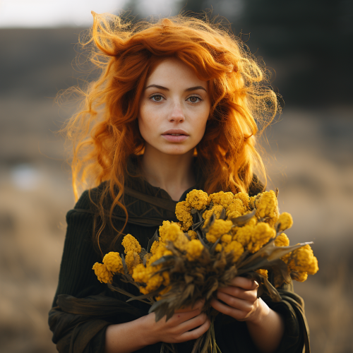 gorgeous medieval woman, viking lady, holding rhodiola rosea in her hands, holding yellow golden root in her hand, brushstroke, no makeup, natural, outside