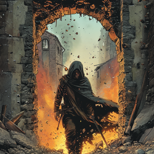 Indie comic book cover a hooded wounded survivor coming out of the rubble in a collapsed door frame in a medieval village in flames --v 6.0