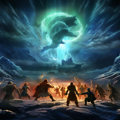 A dynamic battle scene frozen in time, where warriors clad in brightly colored furs clash beneath auroras that tell the story of their conflict. The auroras themselves are depicted with ancient symbols and scenes of past glories and defeats, creating a living history in the night sky.