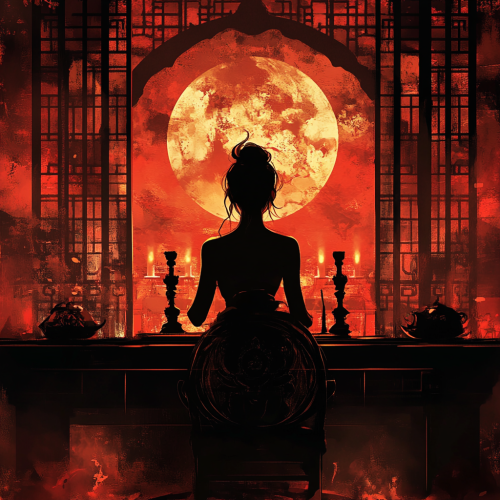 dungeons and dragons, fantasy, illustration, comicbook artstyle, silhouette of a female, an asian woman sitting behind a red divider, candels, high class room, expesive atmosphere