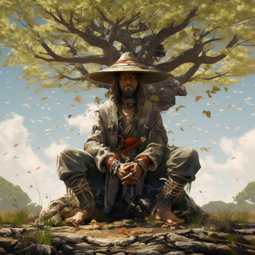 meditating japanese warrior in a farmers hat sitting under a tree. Midday, high resolution, detailed