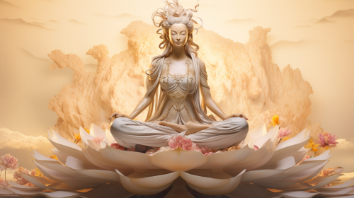Photorealistic rendering of a Buddhist sanctuary, diagonal perspective of devotees sitting in zazen, hands pressed together in prayer, imposing gilded Buddha figure in background, incense haze --ar 16:9 --s 50