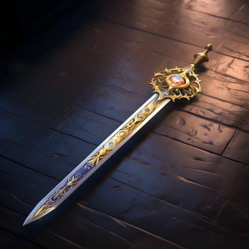 a free floating sword, blessed by the morning light shining on the reflective hilt, Golden pommel, embossed with holy glyphs