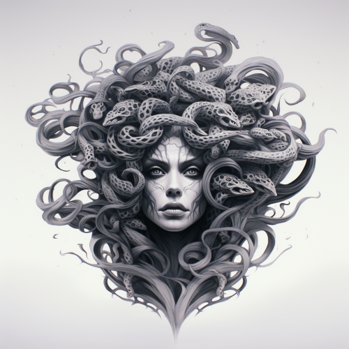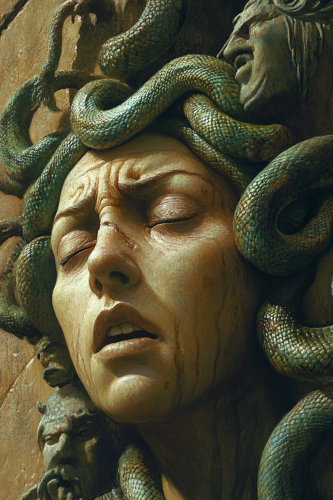 a portrait of Medusa with snakes around her head, surrounded by many serpents. In the style of digital art, with dark cyan and gray tones, realistic hyper-detail, digital art techniques, sculpted details, and a light emerald green color. --ar 16:9 --s 750 --v 6.0