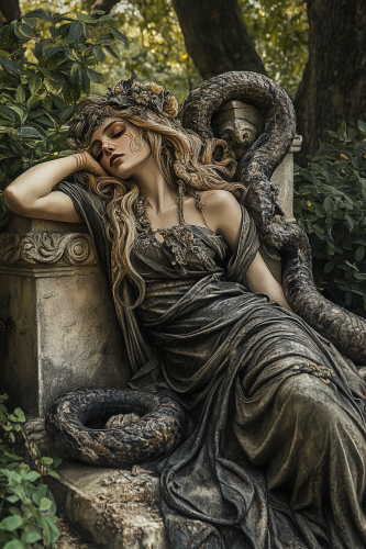 Medusa surrounded by statues, snakes for hair, style of Doug Kovacs, Boris Vallejo, Sanjulian, Julie Bell style, artgerm, greg rutkowski, alphonse mucha, frank frazetta --ar 2:3