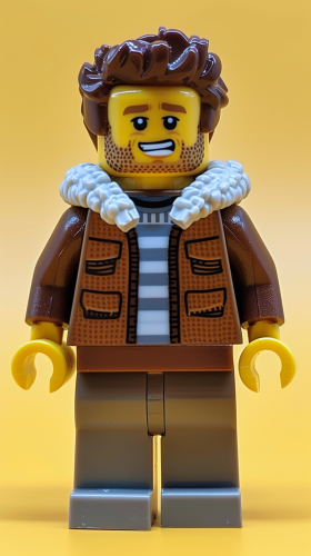 Create a LEGO version of a man with a square face and strong jawline, featuring a short, well-groomed brown beard. The LEGO figure has short, spiky brown hair styled with volume, and light brown eyes with a focused expression. The figure is dressed in a LEGO-style version of a brown corduroy jacket with cream fur lining, and underneath, a gray sweater with collar details. The build is medium, with broad shoulders, and the overall figure should resemble classic LEGO design with blocky limbs and simplified features, but capturing the essence of the person’s appearance. --v 6.0 --ar 9:16