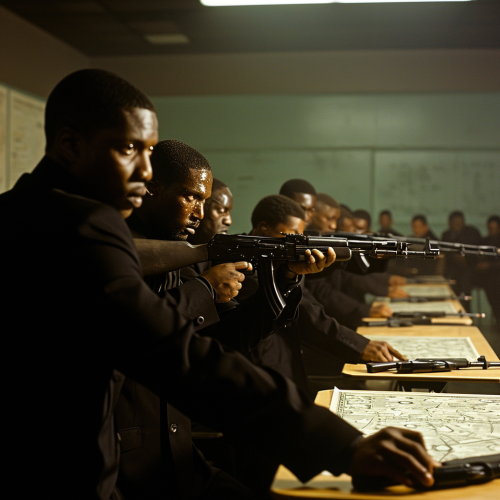 a group of black men with black clothing are in a classroom with automatic rifles being taught tactical strategy on a board by a man in a black suit, christopher Nolan movie --v 6.0