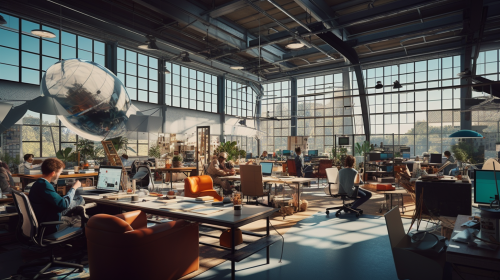 super hip industrial space startup environment with eames furniture, big factory windows, some hipsters working, realistic photo --ar 16:9