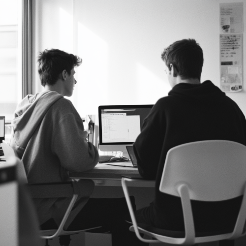 A photorealistic image of a rugby-style scrum set in a sleek, modern office space. The participants, all men, are dressed in rugged, machine-inspired workwear, combining the essence of industrial grit with corporate teamwork. The office setting subtly incorporates elements of collaboration and unity, with bright lighting that emphasizes the dynamic and determined spirit of the team, reflecting strength and cohesion in a business context.