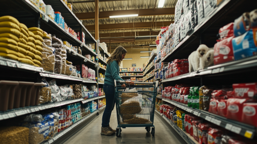 Low angle shot following behind a dog in a Tractor Supply Store parking lot as it walks towards a new pickup truck with horse trailer attached on a bright beautiful day. There is a woman pushing a shopping cart behind the dog following it. The happy scene is captured in a commercial ad style photography, with a wide shot and cinematic feel. --ar 16:9 --v 6.1