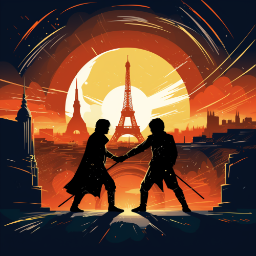 a cover for a noir novel; with, in the center of the image, on 2/3, two full-length men, back-to-back, one handsome,with shoulder-length hair, smoking a cigarette, wearing a borsalino hat; the other, cute, shorter, with a huge smile; black-and-white illustration; steampunk style; --ar 2:3 --niji 6