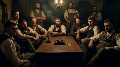 11 Men Exactly. Eleven men. Every man is smoking a pipe. All the men are smoking a pipe. 11 men in a hostel. Eleven Men sitting around a table on couches and broken chairs. The Eleven Men are Smoking pipes. Every man has a pipe. They look pretty shady. There is oregano cut up finely in a bowl in the middle of the table and plastic cups with beer. Realistic Photograph. Oregano in a bowl on the table, very green. Viewpoint is 30% angle from 10 feet away. High resolution photo. Photographic. --ar 16:9 --chaos 0 --no cartoon
