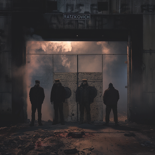 four men standing in front of a steel bunker doors. doors are made of solid steel, big valve visible. it's evening, all of them are lightly visible, rather as silhouettes, all of them smoking cigarettes. there are marks of a red liquid visible in front of the doors, like movie scene, ultra realistic --aspect 7:3 --v 6.0