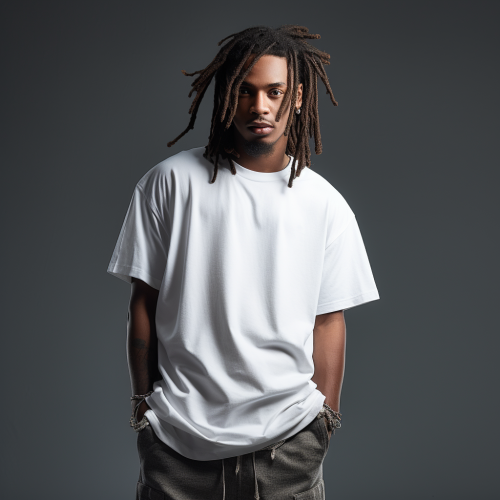 Men's black plain t-shirt, oversized t-shirt, Elegant yet modern style, sacai style, Performance-oriented, timothee chalamet like male model, Canon EOS R5, Canon RF 50mm f/1.2L USM, High-resolution editorial studio photography, white studio background, Fujifilm Neopan Acros 100 II