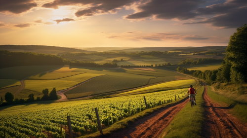 A man on a bicycle in Champagne Landscape in June 2023, dropping his handlebars, arms outstretched, symbol of freedom, The lighting should be dramatic and moody, with the setting sun casting long shadows and highlighting the scene. The image should be hyper-realistic, highly detailed and in high resolution 16k. Use a Canon EOS 5D Mark IV digital SLR camera with an EF 24-70mm f/2.8L II USM lens. The settings should be ISO 100, f/8, with a shutter speed of 1/125, to capture the fine detail and striking contrast between man and scenery. --ar 16:9 --v 5.1 --style raw --s 750