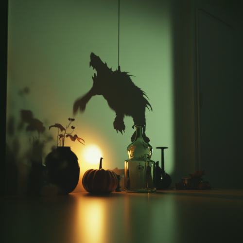 a dark fall halloween night with the silouhette of a forest in the background under a full moon. candles and leaves everywhere among the many yellow, orange, and red leaves scattered everywhere and on the trees as well as lit, evil looking jack o lanterns