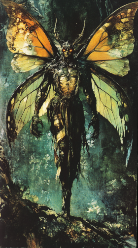 Illustrate a whimsical yet eerie character of a clown with a mushroom-like hat, blending Edward Gorey's style with a fantastical forest theme. The clown should have a simple, expressive design with a subtle smile, evoking both charm and unease. Use intricate cross-hatching to give texture to the clown’s face, hat, and outfit, emphasizing the organic, fungal elements. The hat and clothing should resemble delicate, detailed mushrooms, with tendrils and spore-like shapes growing around. The background should be minimalistic, with only faint suggestions of a forest floor or twisted roots, enhancing the character's surreal isolation. Include symbolic details, like small mushrooms or gnarled branches, to create a haunting, fairy-tale atmosphere.