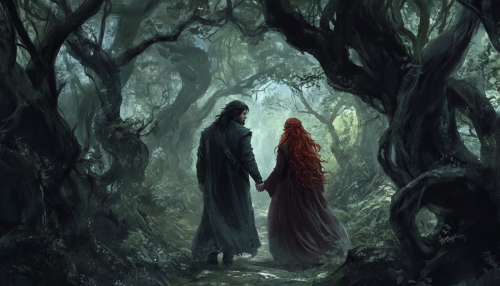 Mystical and gloomy illustration in the style of artist Ivan Bilibin. A large gray wolf with bright glowing yellow eyes, protects an infant boy in a red Russian caftan, boots and a hat with fur. All around is a dark impenetrable spruce forest, with thin twisted birch trees in the foreground. The overall style is inspired by Slavic folklore with a dash of fantasy and medieval symbolism --s 750 --niji 6