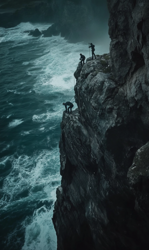 elevated view shot, aerial shot, 4 people climbing up the side of a cliff in a dark stormy spooky british island, you can see the menacing sea below them, choppy waves, one person is at the top of the cliff and is holding on dangling off the edge looking scared, spooky, ultra realistic, hyper realistic, 4k, 8k, --ar 3:5