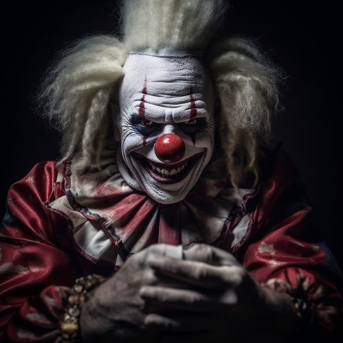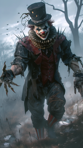 A dark and atmospheric still set in a spooky forest. The clown is very stocky, wearing a black top hat and a tattered red and black jacket with spike details, and has a creepy face with a creepy smile and hollow, creepy eyes. His left arm has a metal claw, and one hand is outstretched, holding several sharp blades between his fingers, ready to be thrown at any moment. The background is a misty, desaturated forest, with silhouettes of dead trees and mist creating an eerie atmosphere. The colors are muted, with a focus on grays, blacks and dark reds to emphasize the horror theme. The clown's facial expression is menacing, and the overall style is gritty, realistic and highly detailed, capturing the creepy atmosphere. Realistic 3D style, shot with Canon EOS R5. --niji 6 --ar 9:16