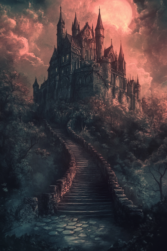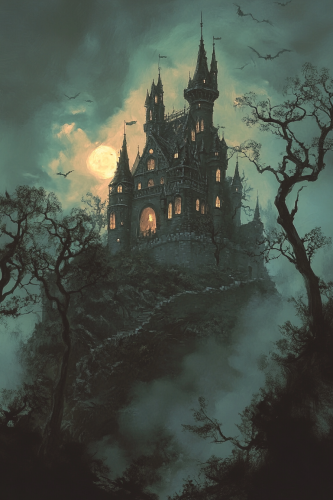 an illustration of an fantastic whimsical sacry spooky romanesque castle high on a hill within dark haunted forest, in the style of Daniel Merriam, soft tones --ar 2:3