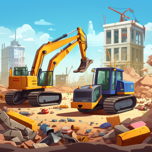 cartoon construction site with excavator, concrete mixer, bulldozer, tipper truck. the foundations of the new house and the workers are visible