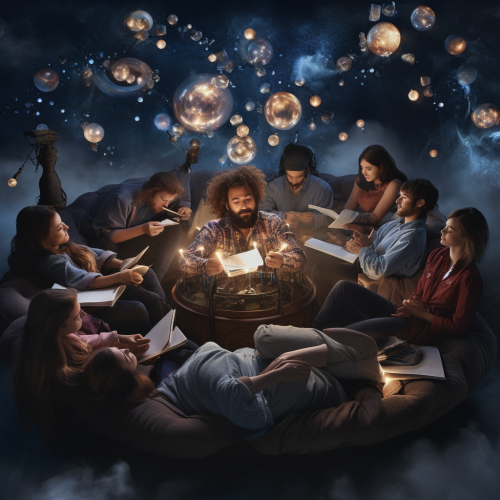 a hyper photorealistic small group of people lying together, but not intertwined, with their heads in the center, in a wonderous nighttime dream circle, with a brighly lit, spectacular surrealist dreamtime thought bubble connecting them all