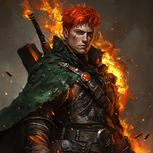 A portrait of Kvothe, the legendary character from The Kingkiller Chronicle. He has vibrant, fiery red hair that flows wildly around his face, intense green eyes that resemble fresh spring grass, and fair skin typical of a traveling performer. He is slender and lean, with an agile and wiry build, of average height. His expression is sharp and animated, capturing a mix of curiosity, determination, and a hint of weariness from his adventures. The background evokes a sense of magic and mystery, perhaps an inn filled with shadows or a windswept road under a twilight sky, suggesting a world of legend and storytelling --ar 3:2 --style raw --v 6.0