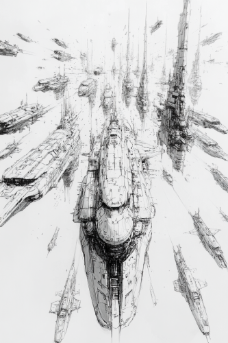 fisheye lens view of the an armada of Star Ships, hundreds of war ships, drawn with a technical pen drawing with thick and thin lines, messy and rough sketch --ar 2:3 --stylize 250 --v 6.1