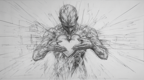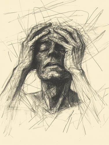 A rough, chaotic pencil sketch with unsettling, mysterious, spiritual, chaotic pencil lines, depicting a figure in a state of deep distress. The figure is contorted, with abstract, jagged lines conveying intense emotional or physical pain. The hands may be clutching the head or chest, symbolizing inner turmoil. The overall sketch is intentionally rough and disordered, emphasizing the overwhelming sense of suffering and struggle. The background remains minimal, allowing the chaotic lines and distorted posture to convey the depth of the figure's agony in a haunting, abstract style. --c 8 --ar 3:4 --v 6.1